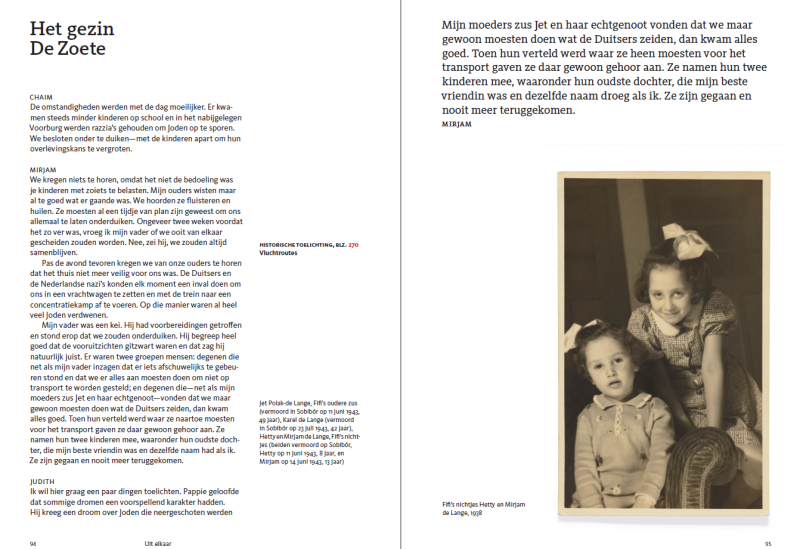 Maar ook de getuigenissen in het Engels staan vol treffende en herkenbare verwijzingen naar de Nederlandse cultuur en maatschappij in de periode rond de Tweede Wereldoorlog. Er wordt verteld over het vooroorlogse leven van Joodse gezinnen in Rotterdam en Apeldoorn, over het Montessorionderwijs dat de kinderen daar genoten, over de verzuiling die zo kenmerkend was voor de Nederlandse samenleving. En vervolgens, als de oorlog begint, komen we van alles te weten over onderduikadressen in allerlei delen van het land, over Nederlandse verzetsstrijders en collaborateurs.