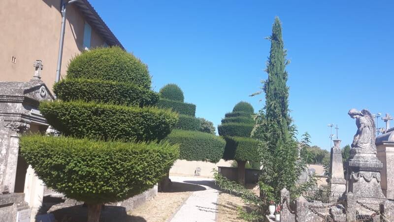 Zoals wel vaker bezochten we ook de plaatselijke begraafplaats. We zagen imposante, goed verzorgde familiegraven, omgeven door opvallend fraai getrimde bomen. Er liep zelfs een beheerder rond, een man van middelbare leeftijd. De families uit het dorp hielden hun voorouders in ere.