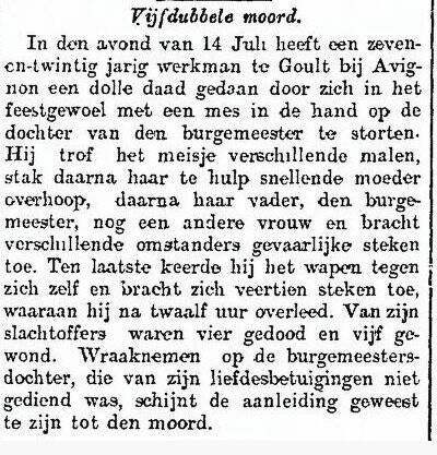 Hij vertelde ons een tragisch verhaal dat ik later op internet bevestigd zag. Het drama blijkt zelfs de Nederlandse pers te hebben gehaald, en wel de Schiedamse Courant van 21 juli 1900. Een eenzame, alleenstaande jongeman uit het dorp was verliefd geworden op de populaire burgemeestersdochter. Hij was een simpele ziel aan wie niemand veel aandacht wenste te besteden. Toen hij haar ten huwelijk vroeg, wees ze hem dan ook af, iets wat hij niet kon verkroppen. Midden in het feestgedruis van de 14de juli was hij met een mes op haar afgestapt en had hij op haar ingestoken. Haar moeder, haar vader en een omstander probeerden in te grijpen, waarna hij ook hen om het leven bracht. Hij zwaaide wild om zich heen, er vielen nog eens vijf gewonden en hij deelde ook zichzelf een aantal steken toe. Een halve dag later bezweek hij.