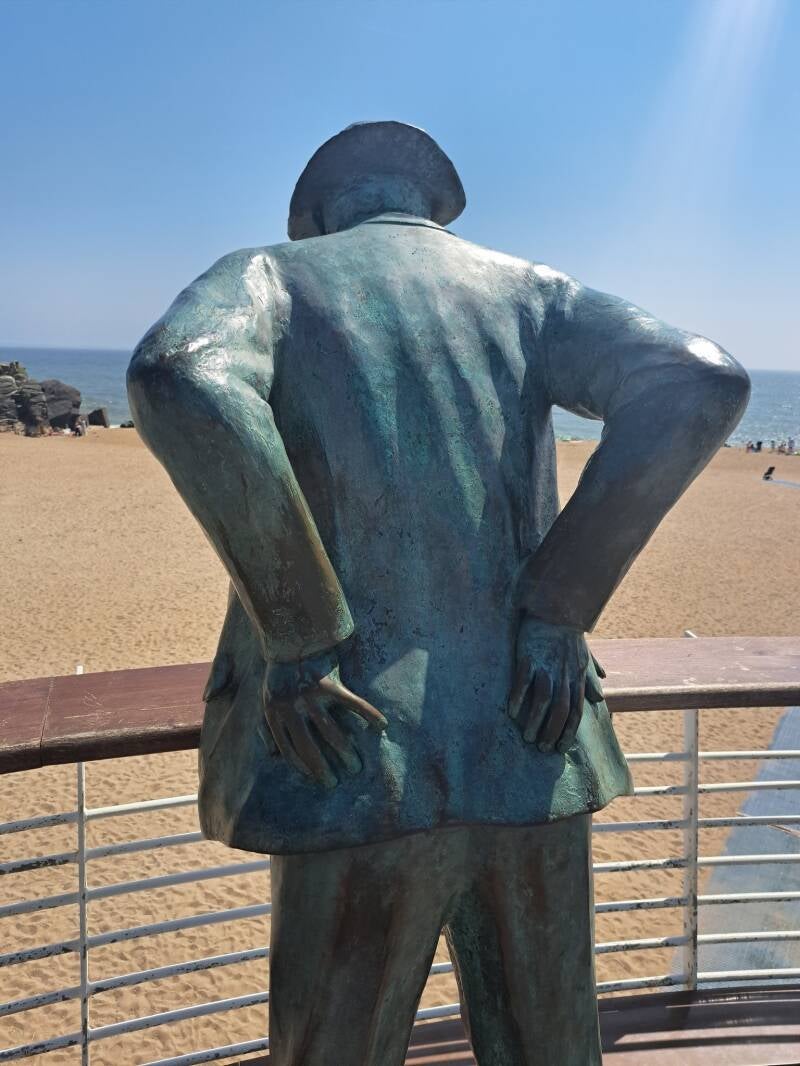 Monsieur Hulot was er zelf ook, want sinds 1999 staat er een bronzen beeld van hem dat over het strand uitkijkt. Licht voorovergebogen in een karakteristieke pose, want Tati had een lang lijf en als rasechte mimespeler benadrukte hij op die manier niet alleen zijn slungelachtige voorkomen, maar ook de onbeholpen gretigheid waarmee Monsieur Hulot contact zocht met anderen.